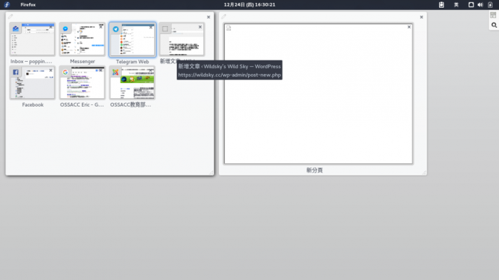 前兩天是師大資訊研究社的服務學習說明會,邀請到 MozTW 的 Irvin 和教育部 ossacc 的 Eric 來我們學校跟大家開個說明會聊個天。今天要講的不是這個服務學習說明會要幹嘛,而是在跟 Irvin 聊天時發現他的 Firefox 有個神奇的功能「釘選分頁」!!問了幾個有在用 Firefox 的同學,結果大家都不知道這個功能XD 所以就想寫一下文章記錄一下,說不定會對剛好逛到這裏的人有所幫助。