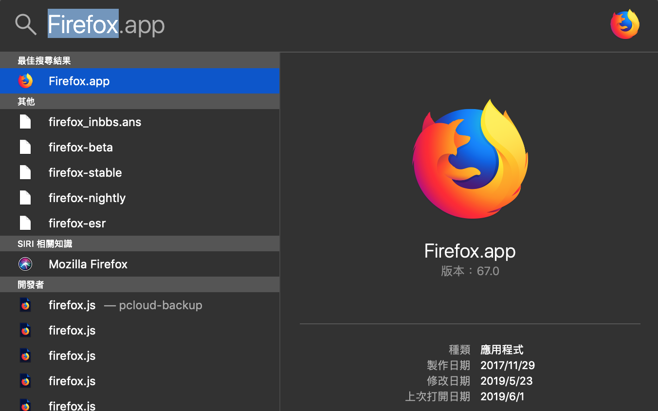 除了前面提到的 Command + Q,另一個必須要會的就是叫出 Spotlight(預設可能是 Command + 空白鍵Control + 空白鍵),用快捷鍵叫出 spotlight 的話可以讓開 App 變成一秒內的事。