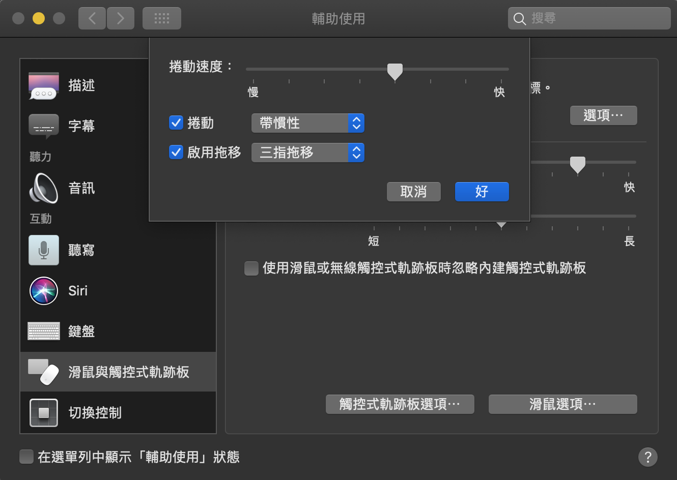 此外,也可以加速游標移動速度,設定於 左上蘋果圖標 > 系統偏好設定 > 觸控式軌跡板 > 點按 裡面的 軌跡速度,我自己是調到最快,這樣移動會超級隨心所欲。