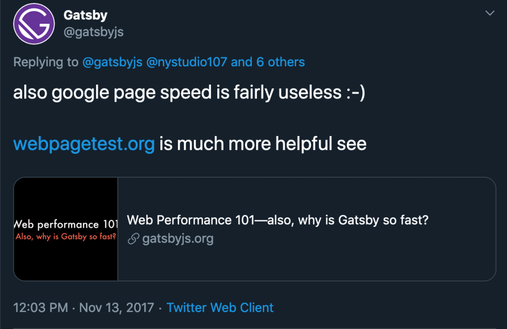 「Google Page Speed 不太有用。」 -—— Gatsby on Twitter, 2017